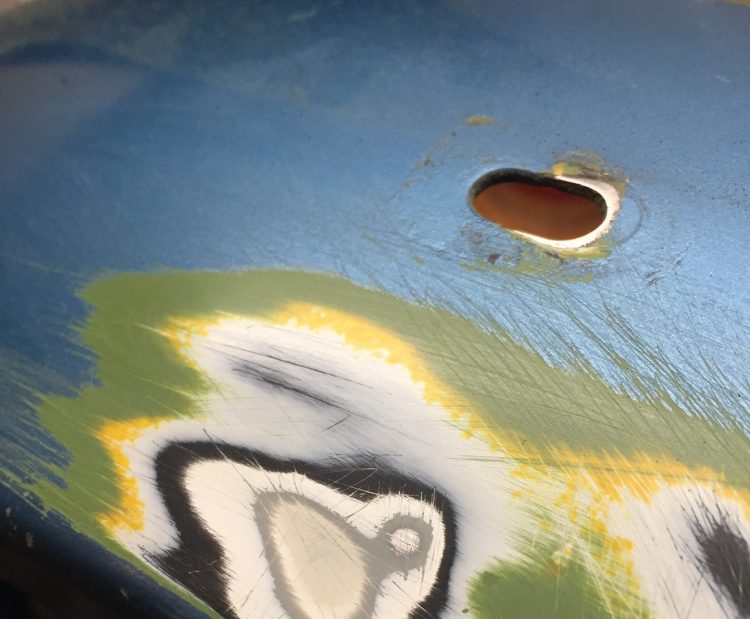 Nella prima foto di tutti gli strati di colore dati sui parafanghi, si nota come negli anni si sia cercato di “aggiornare” l’estetica della moto cambiandone il colore, anche il serbatoio ha subito gli stessi trattamenti anche se con qualche strato in meno di vernice.